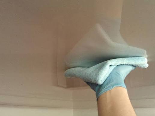 Отмывать натяжные потолки от копоти и сажи нужно так, чтобы не повредить их. Поэтому перед началом работы с рук снимают ювелирные украшения.