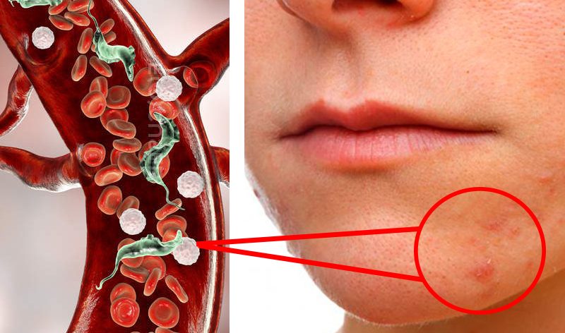 Частым признаком наличия гельминтов, являются различные высыпания на коже. Кроме этого, может возникнуть угревая сыпь, акне и прыщи. Эпидермис заметно грубеет и становится суше. Часто кожа покрывается ранними морщинками, трескается на пятках, может начаться очаговое выпадение волос, отслоение ногтей. Все эти симптомы указывают на расстройства в работе пищеварительного тракта и на возможное заражение.