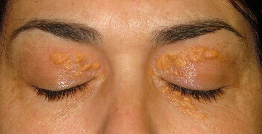 Что такое ксантелазмы? Это такие беловатые, иногда желтоватые пятнышки, которые могут находиться вот здесь, вот здесь, вот здесь. И часто на них люди не обращают внимания. Особенно люди пожилого возраста думают: «Ну, ничего страшного, что-то белое, что-то жёлтенькое». Но если разобраться, из-за чего это происходит, ксантелазмы — это признак того, что у вас очень высокий уровень холестерина.